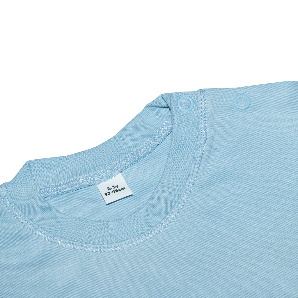 Dětské tričko vyšší gramáže z kvalitní certifikované a zdravotně nezávadné bio bavlny. Tričko na rameni zdobí dva bezniklové patentky v tónu, štítek na tričku je odnímatelný. Toto tričko je dostupné i ve velikostech pro ty úplně nejmenší děti.